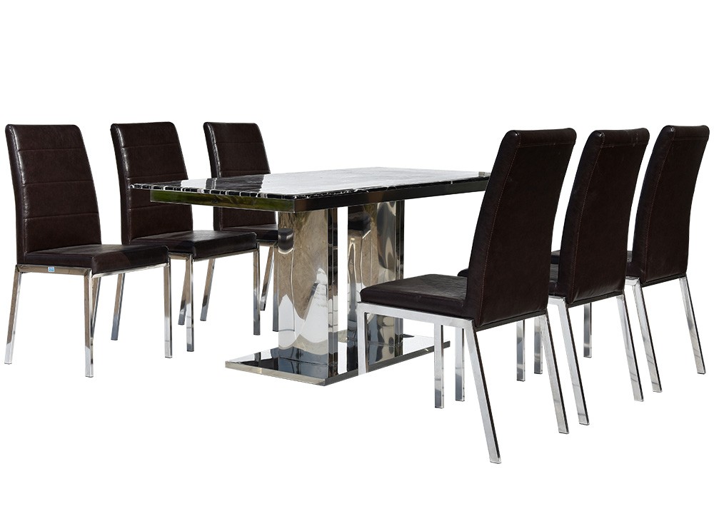 Bộ bàn ghế ăn cao cấp khung Inox, mặt bàn ăn sử dụng chất liệu đá tự nhiên phủ vân nhân tạo.