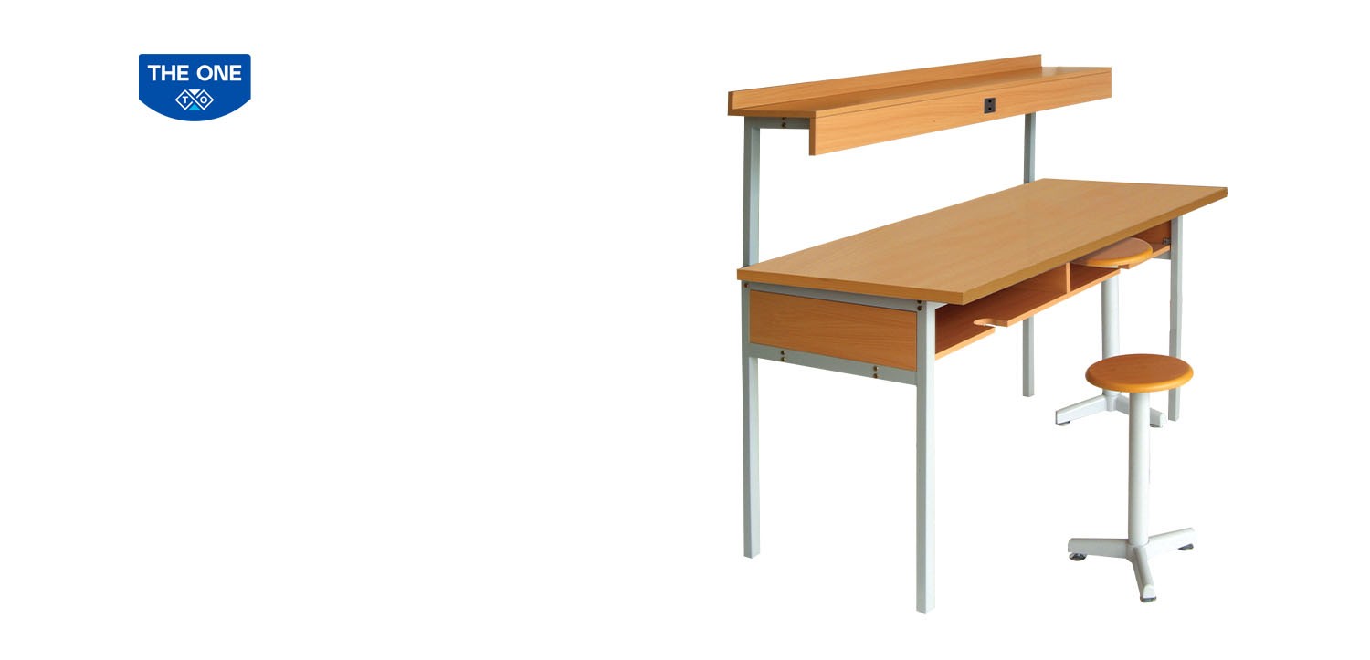 Bàn ghế thí nghiệm vật lý, khung ống thép sơn tĩnh điện. Mặt bàn composite và ngăn bàn gỗ melamine có thêm lỗ cài ghế.