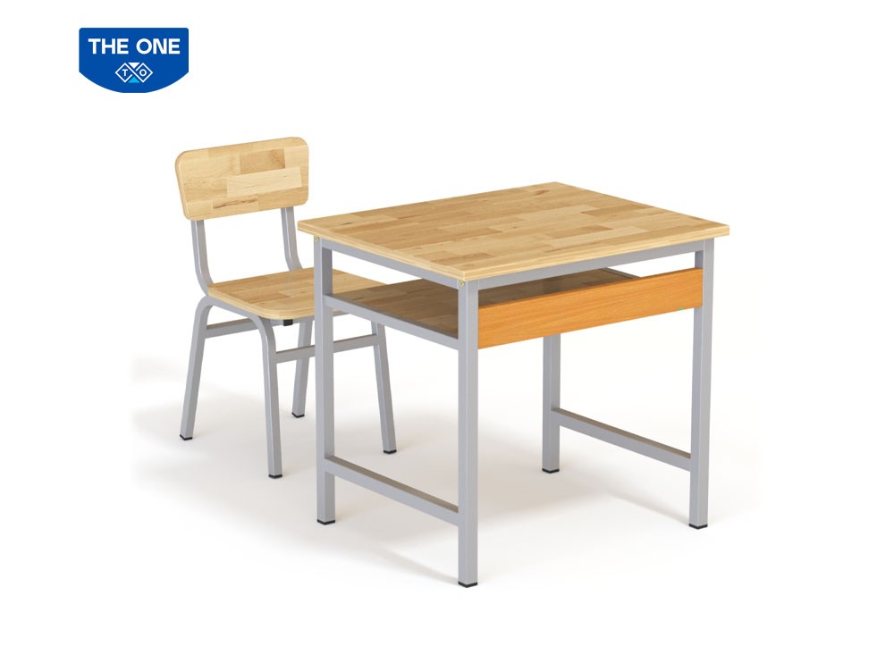 Bàn ghế học sinh đơn. Khung thép sơn tĩnh điện, mặt gỗ tự nhiên được phủ một lớp sơn trong suốt để bảo vệ bề mặt và giữ được mầu sắc nguyên bản của gỗ.