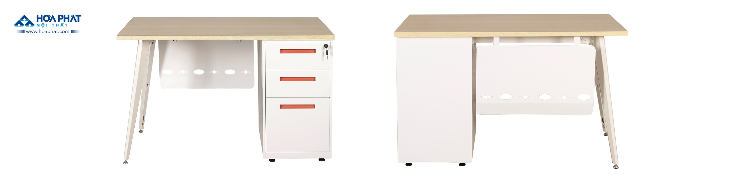 Bàn làm việc có hộc sắt, chân bàn sơn trắng, tay nắm âm màu cam.