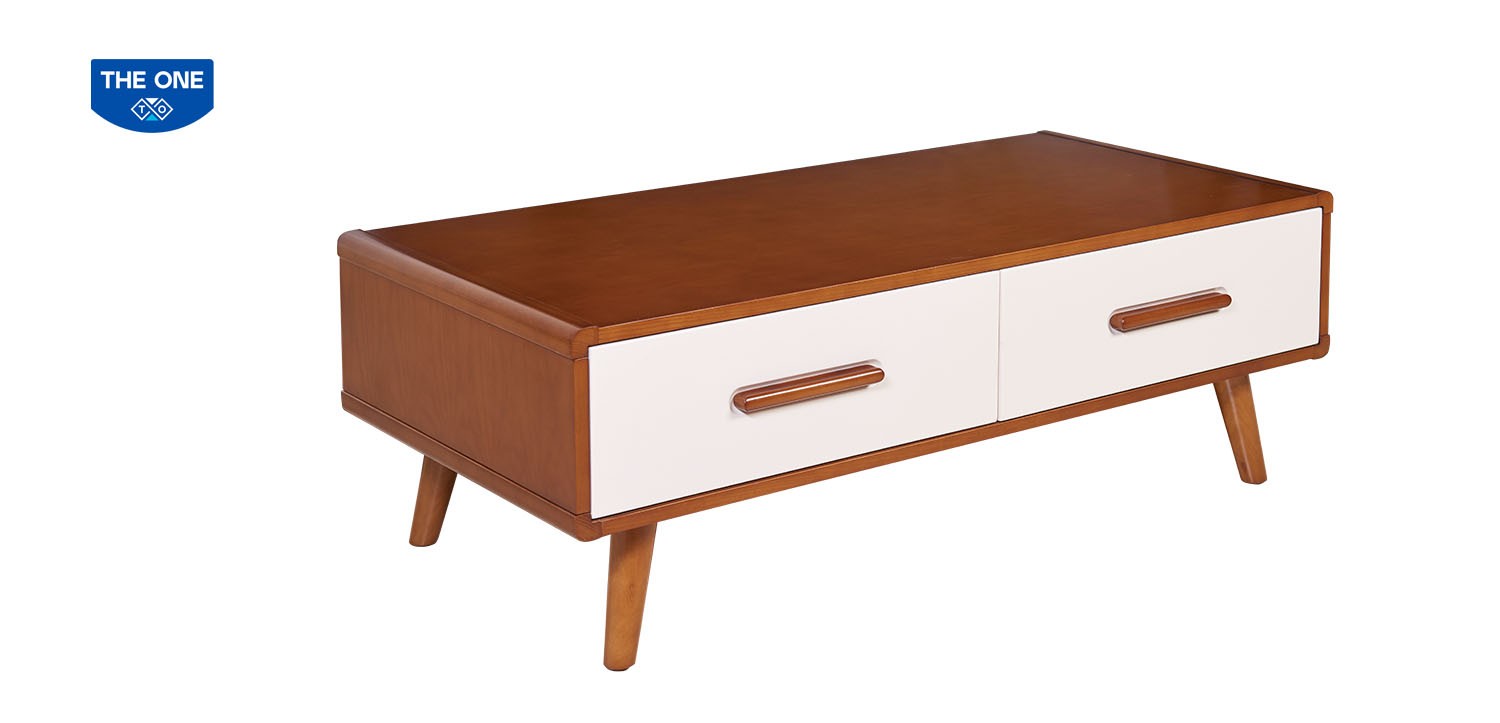 Bàn sofa có hai ngăn kéo sử dụng chất liệu Veneer kết hợp chân bằng gỗ tự nhiên.