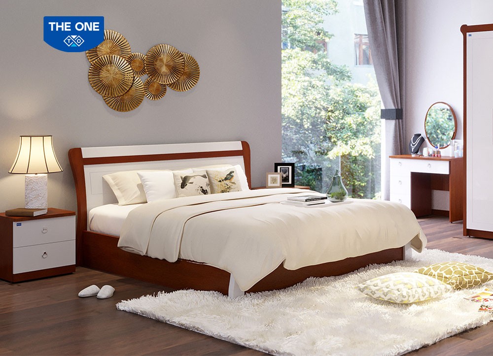 Bộ sản phẩm phòng ngủ người lớn, sử dụng chất liệu gỗ melamine, veneer và sơn Pu cao cấp kết hợp giữa hai tông màu gỗ và trắng.