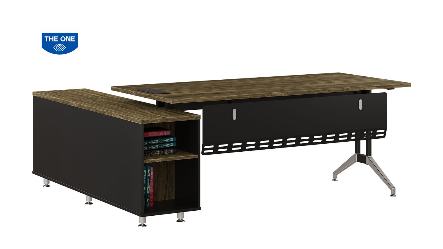 High-class executive desk with MFC desktop and powder-coated combined chrome-plated legs. The desk has a strong crossbar which can be used as a cable trunking.