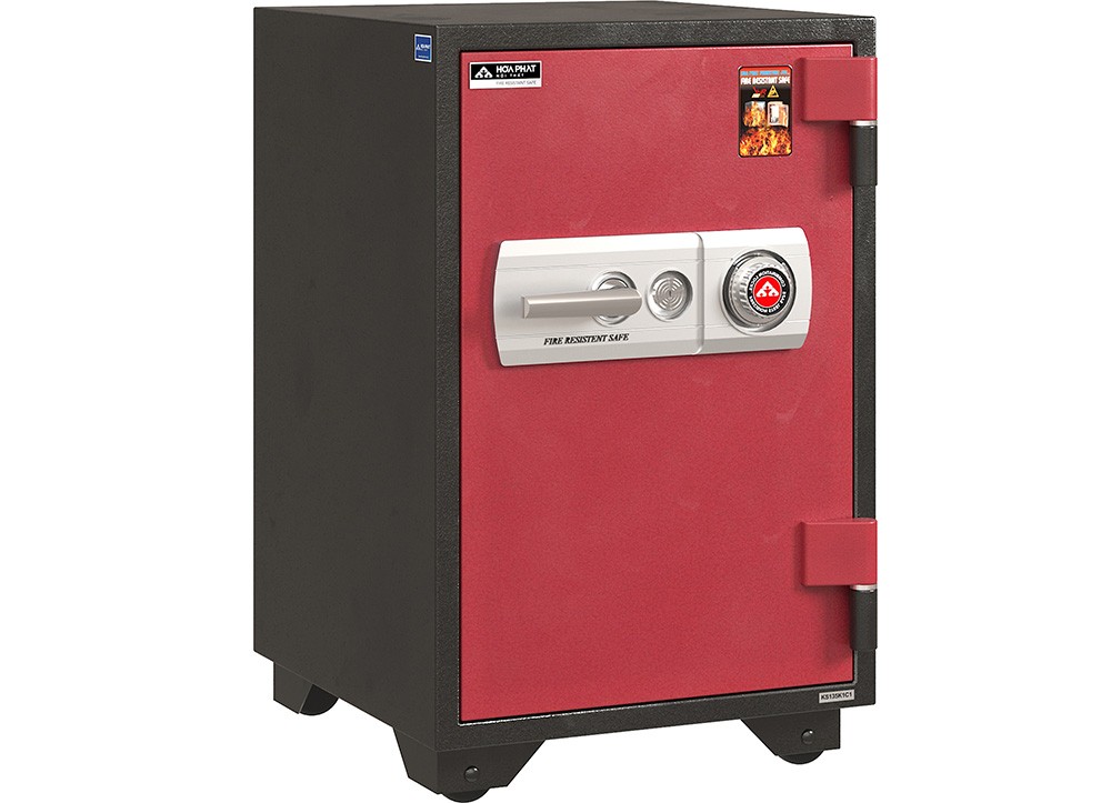 Vertical fire resistant safe box with 1 key lock, 1 combination lock, 1 handle, 1 adjustable shelf, 1 drawer, and iron casters.