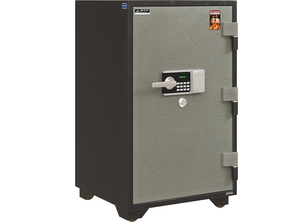 Vertical fire resistant safe box with 1 key lock, 1 digital lock, 1 handle, 1 adjustable shelf, 1 drawer, and iron wheels.