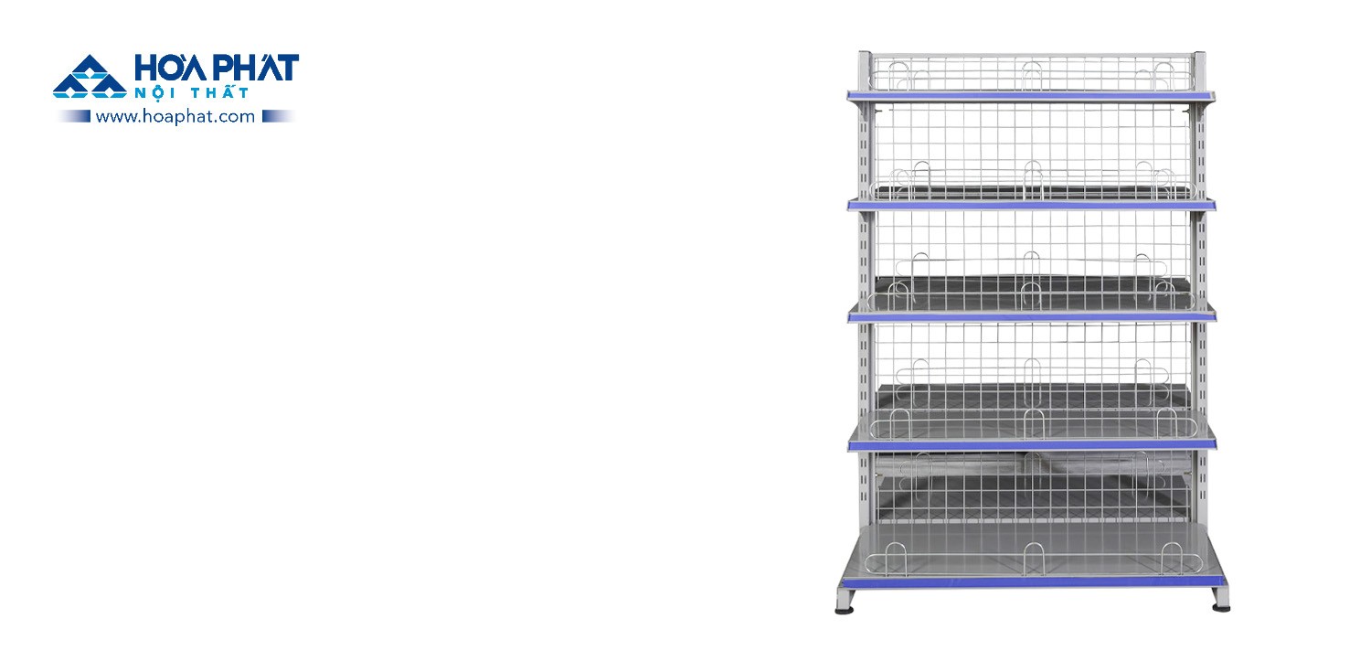 Giá siêu thị để hàng 2 mặt khung thép sơn tĩnh điện, mỗi mặt có 5 tầng đề đồ (gồm đáy và đợt).