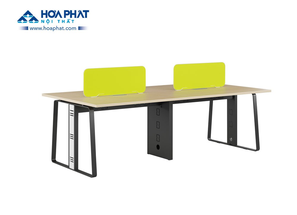 Module làm việc 4 chỗ ngồi, sử dụng ống 10x50. Có máng đi dây điện kết hợp giằng bàn, chân bàn có hộp điện đi dây và tăng cứng khung chân. Vách ngăn gỗ bọc vải nỉ.