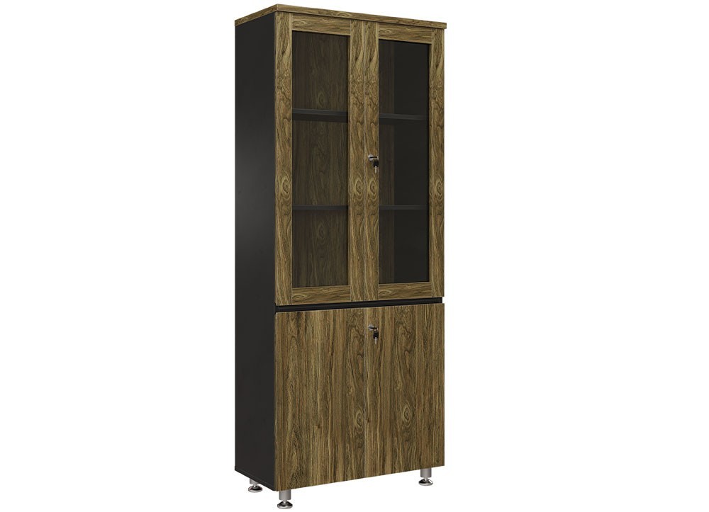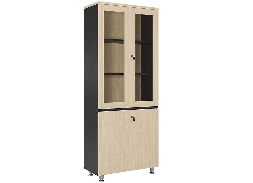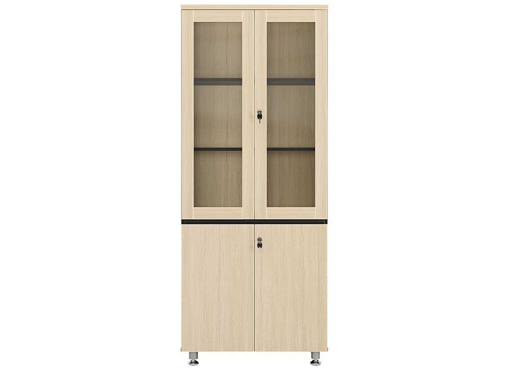 High MFC office cabinet with glass doors above and wooden doors below. The edge is chamfered to open the doors easily.