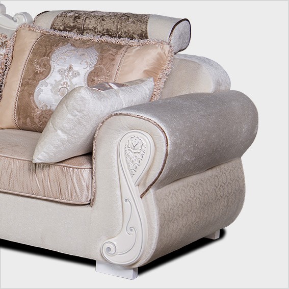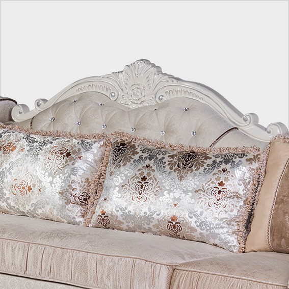 Phần tựa ghế được may trang trí và tạo múi kiểu tân cổ điển, toàn bộ khung ghế được sơn màu trắng.
