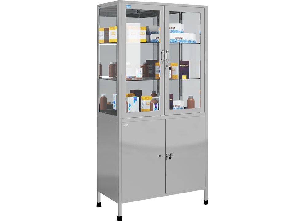 Tủ đề đồ y tế bằng Inox 201, tủ được chia làm 2 khoang gồm: Khoang trên khung kính có 2 cánh kính mở và 2 đợt kính cố định, khoang dưới gồm 2 cánh mở và được chia làm 2 ngăn nhỏ.