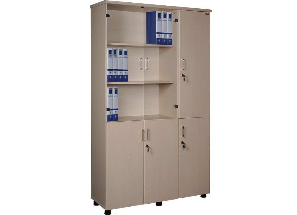 Tủ tài liệu 3 buồng, phía trên gồm 2 khoang cánh kính để tài liệu và 1 khoang treo áo, phía dưới có 3 cánh mở.