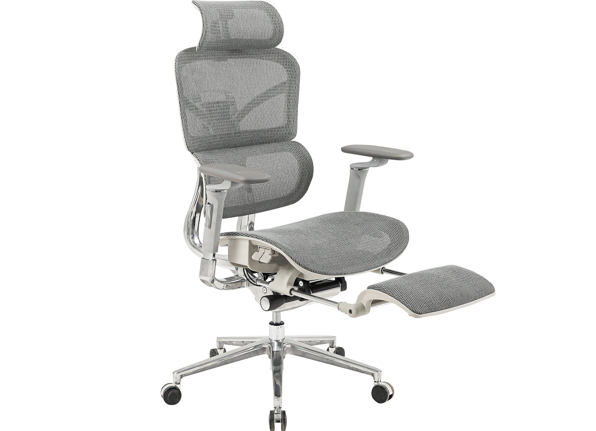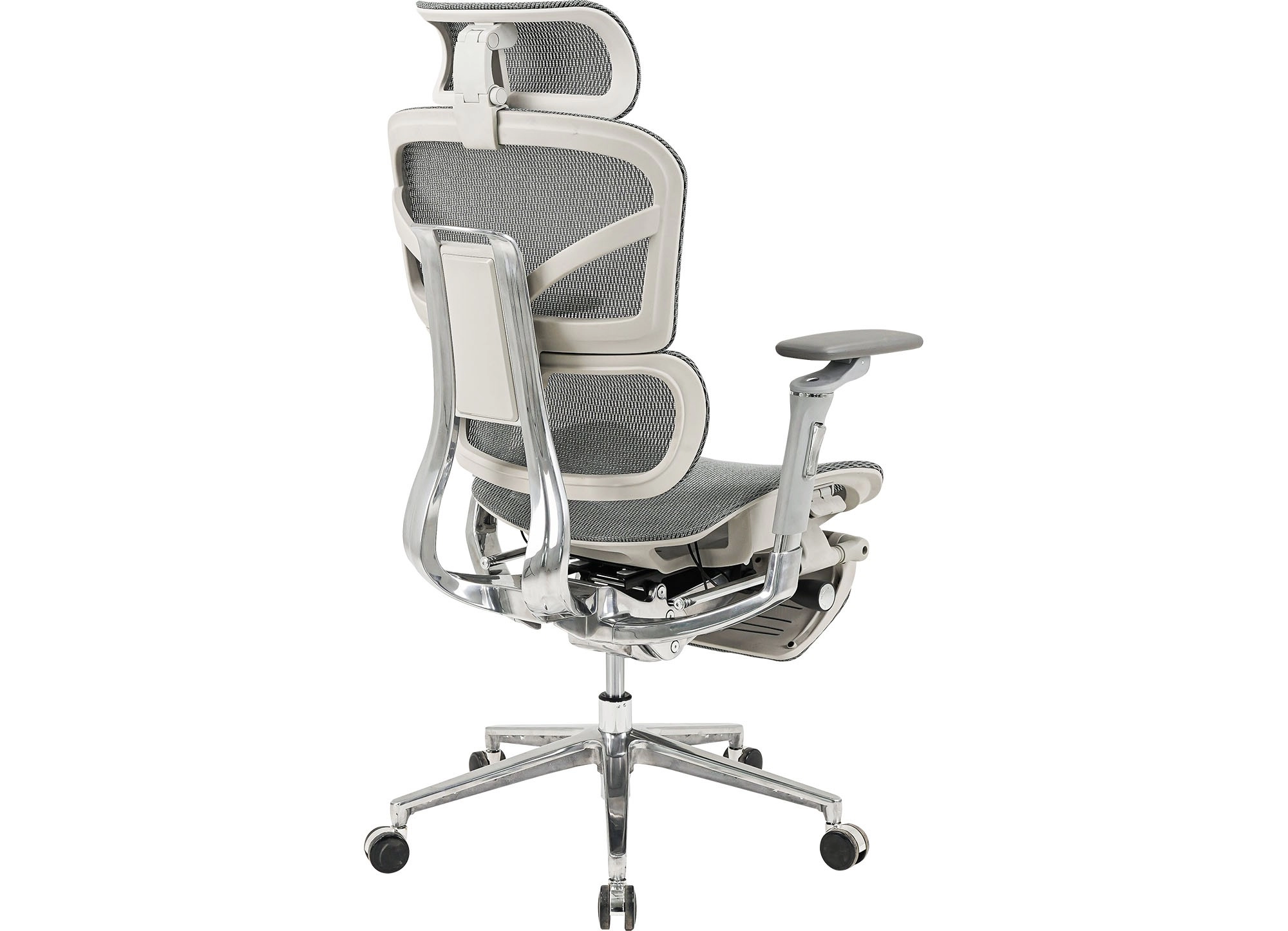 Ghế công thái học cao cấp có cụm tựa, tay, bát ghế bằng hợp kim nhôm, tựa ghế có khả năng điều chỉnh chiều cao và ngả hãm nhiều góc độ.