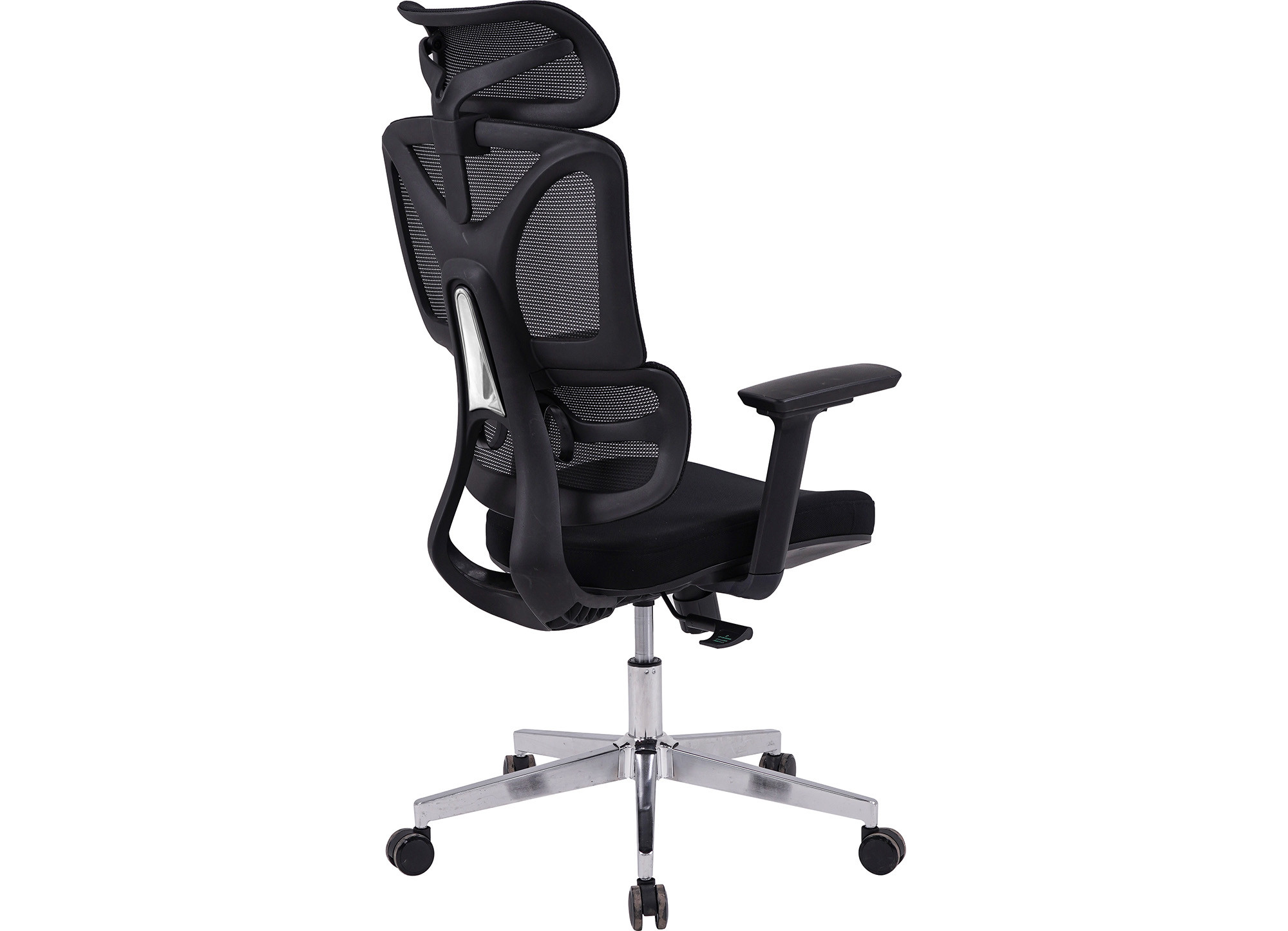 Ghế công thái học hỗ trợ cột sống, đệm mút bọc vải mềm mại, êm ái, dưới đệm có ốp nhựa cao cấp, khung tựa nhựa bọc vải lưới có thể ngả hãm tại 3 vị trí, tựa đầu 2D có thể điều chỉnh cao ÷ thấp và góc độ.