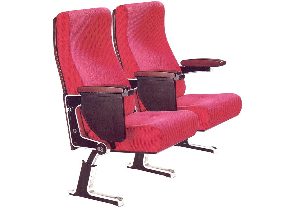 Ghế hội trường cao cấp sử dụng khung nhôm đúc, đệm tựa ghế mút đúc bọc vải và ốp đệm tựa bằng gỗ.