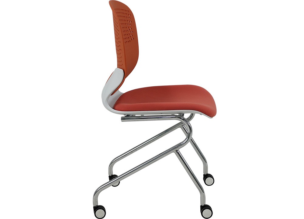 Ghế hội trường khung thép kết hợp đệm tựa nhựa, đệm ghế bọc vải cùng màu tựa. Chân ghế có bánh xe di chuyển