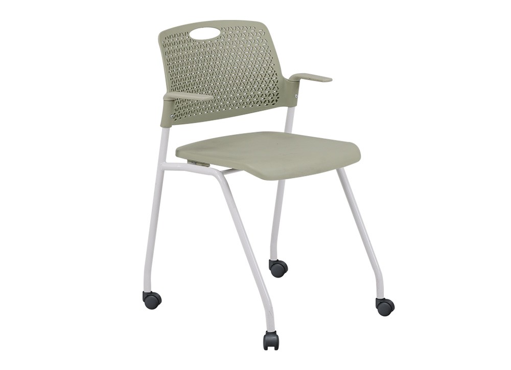 đệm tựa + tay ghế nhựa đồng màu. Ghế có thể xếp lồng lại với nhau theo hàng. Chân ghế bằng thép có bánh xe di chuyển.