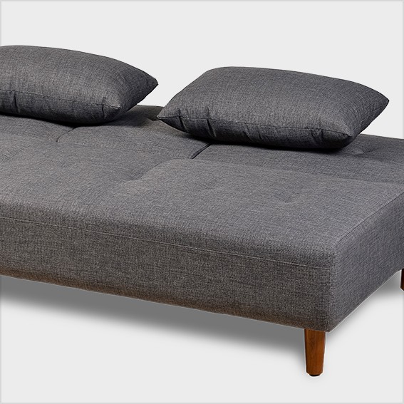 Toàn bộ ghế được bọc vải cao cấp, có 02 gối đi kèm. Chân ghế bằng gỗ tự nhiên sơn Pu.