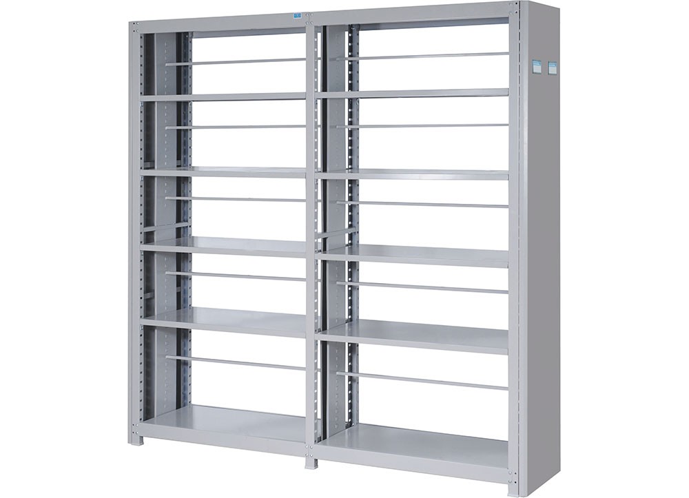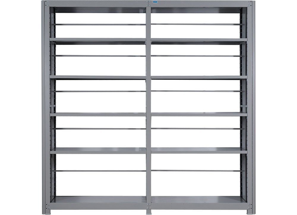 Giá thư viện 2 khoang sử dụng 2 mặt, có 5 tầng để tài liệu. Các đợt và thanh chắn có thể di động giúp điều chỉnh độ cao.