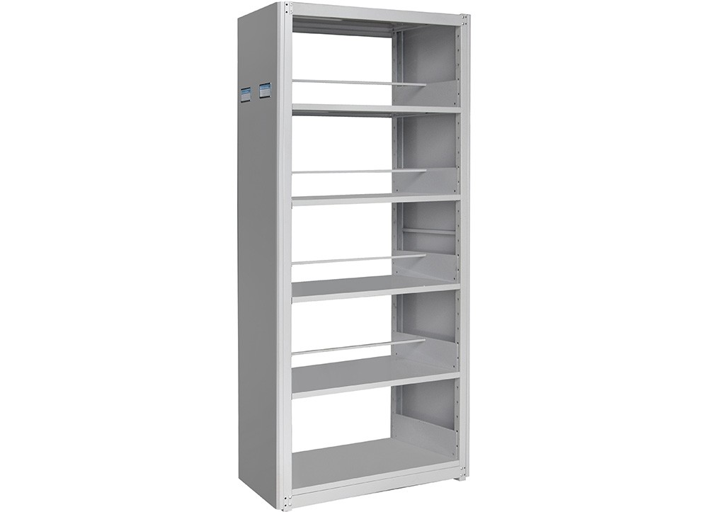 Giá thư viện 1 khoang sử dụng 2 mặt, có 5 tầng để tài liệu. Các đợt và thanh chắn có thể di động giúp điều chỉnh độ cao.