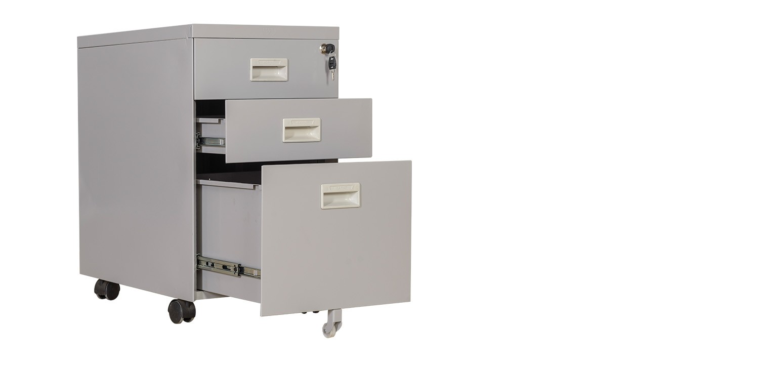 Hộc sắt di động sơn tĩnh điện có bánh xe, có 3 ngăn kéo sử dụng ray bi.