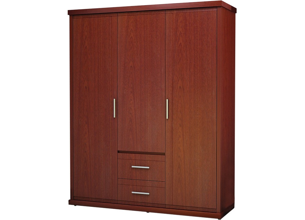 Tủ áo gia đình 3 buồng gỗ công nghiệp và phủ sơn PU. Hai buồng trên cánh dài mở, buồng giữa phía trên ngăn kéo cánh gỗ mở, phía dưới có 2 ngăn kéo.