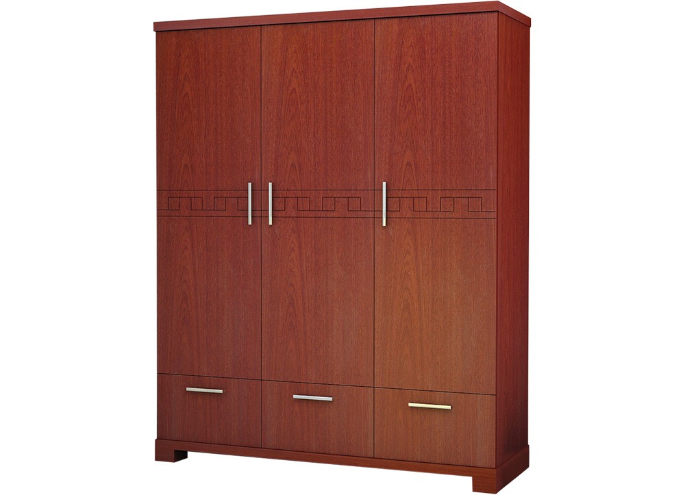Tủ áo gia đình 3 buồng gỗ công nghiệp và phủ sơn PU. Bên trên gồm 3 cánh mở, bên dưới có 3 ngăn kéo.