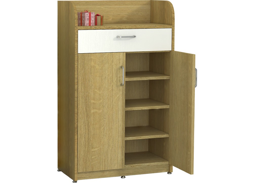 Tủ giầy gỗ công nghiệp Melamine toàn bộ. Tủ được thiết kế gồm 4 ngăn để giầy và 1 ngăn kéo để đồ. Phần nóc được thiết kế để các đồ trang trí.
