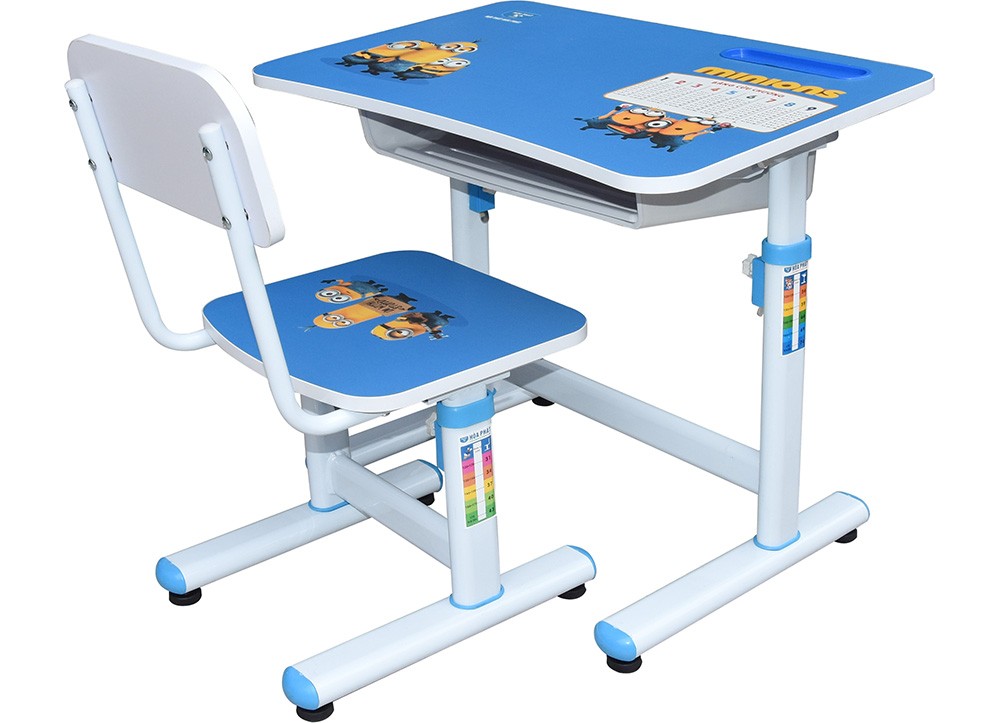 Mặt bàn và đệm tựa ghế gỗ melamine in hình con giống, mặt bàn có thể điều chỉnh độ nghiêng để phù hợp với tư thế ngồi của học sinh.