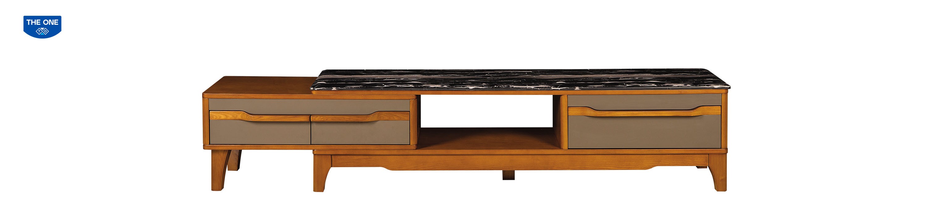 Kệ tivi cao cấp khung gỗ tự nhiên kết hợp gỗ công nghiệp, mặt kệ sử dụng đá tự nhiên phủ vân nhân tạo.