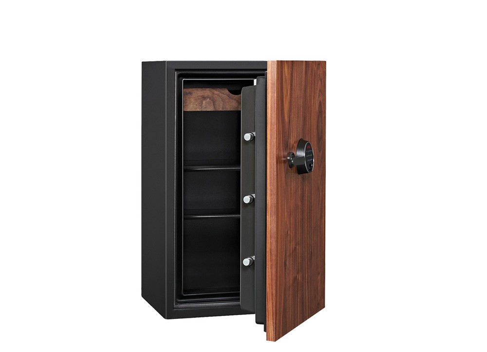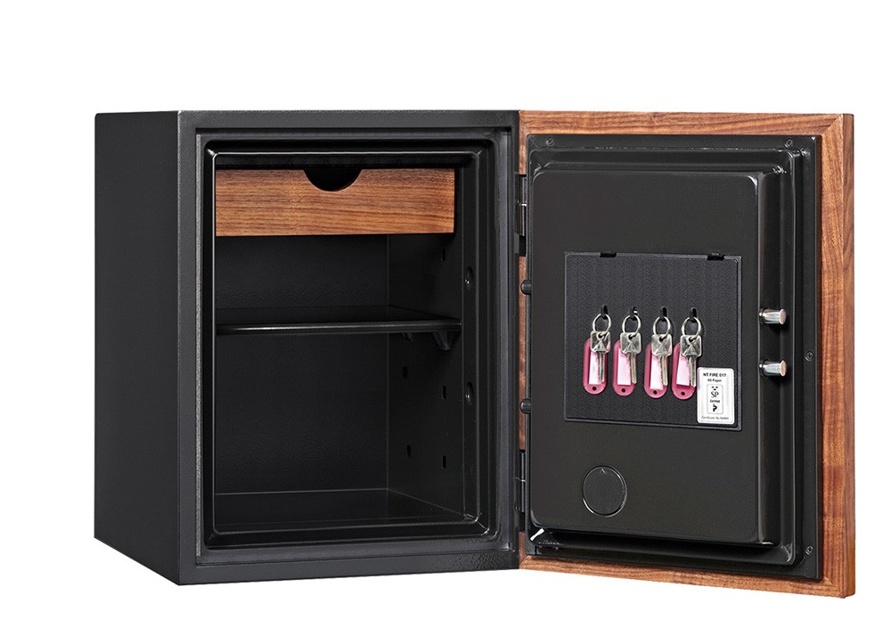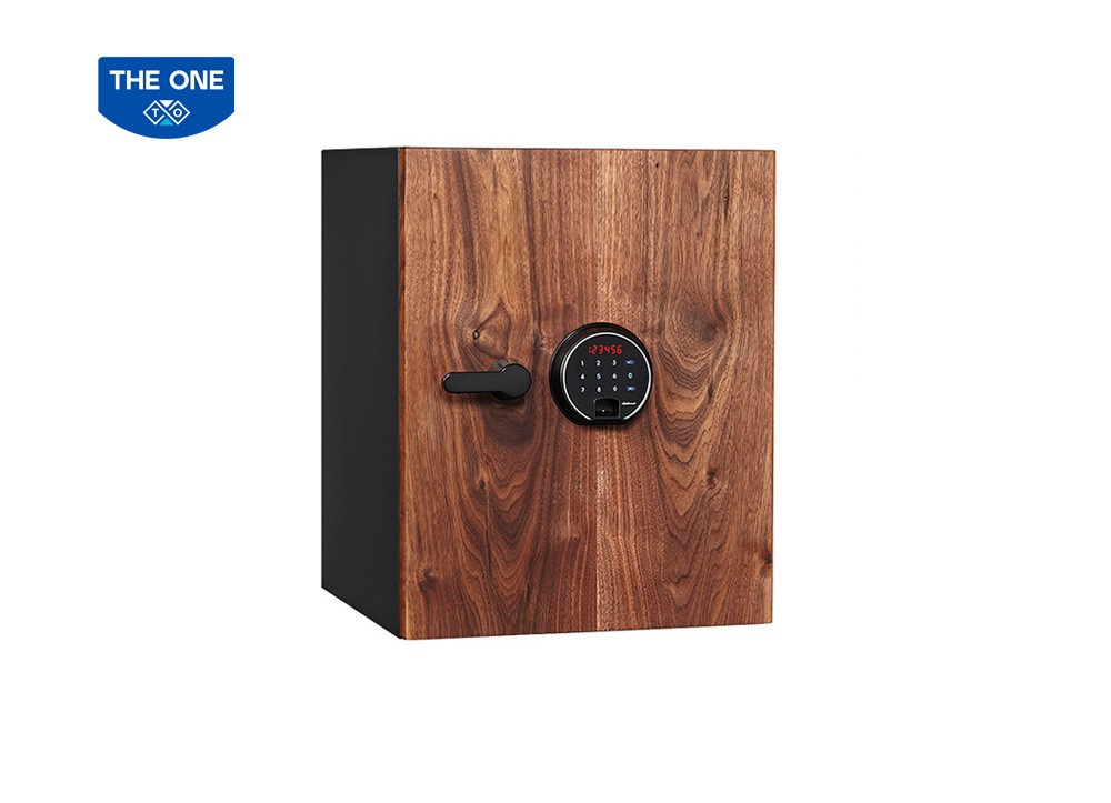 Bề mặt cánh két được bọc gỗ tự nhiên sang trọng, khóa điện tử cảm ứng kết hợp vân tay giúp dễ dàng thao tác đóng/mở cánh và tăng tính bảo mật.