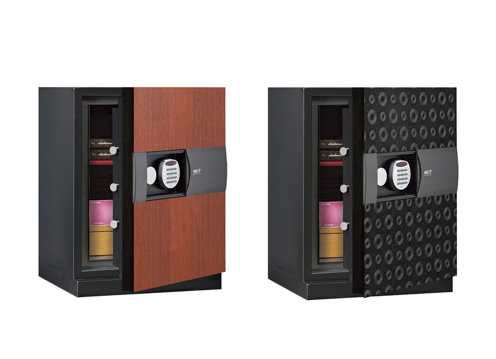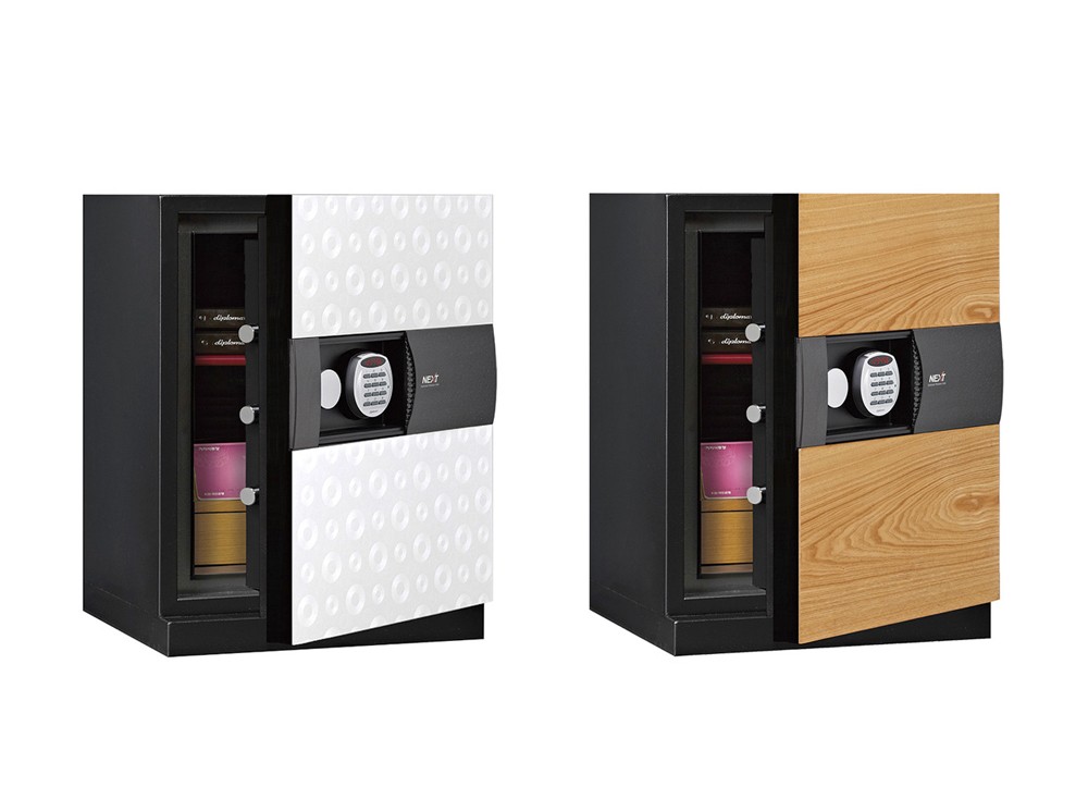 Bề mặt cánh két được trang trí màu gỗ, khóa điện tử kết hợp cảm ứng và vân tay giúp tăng tính bảo mật.