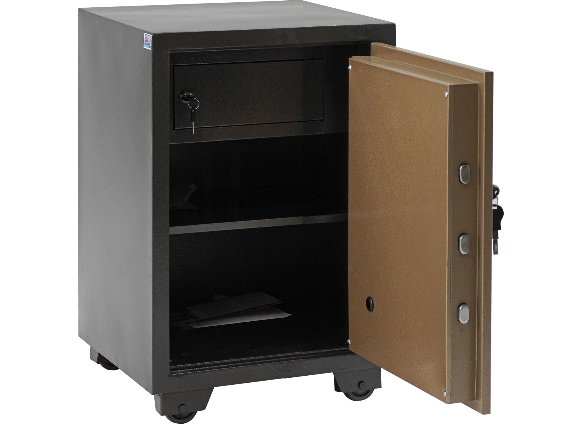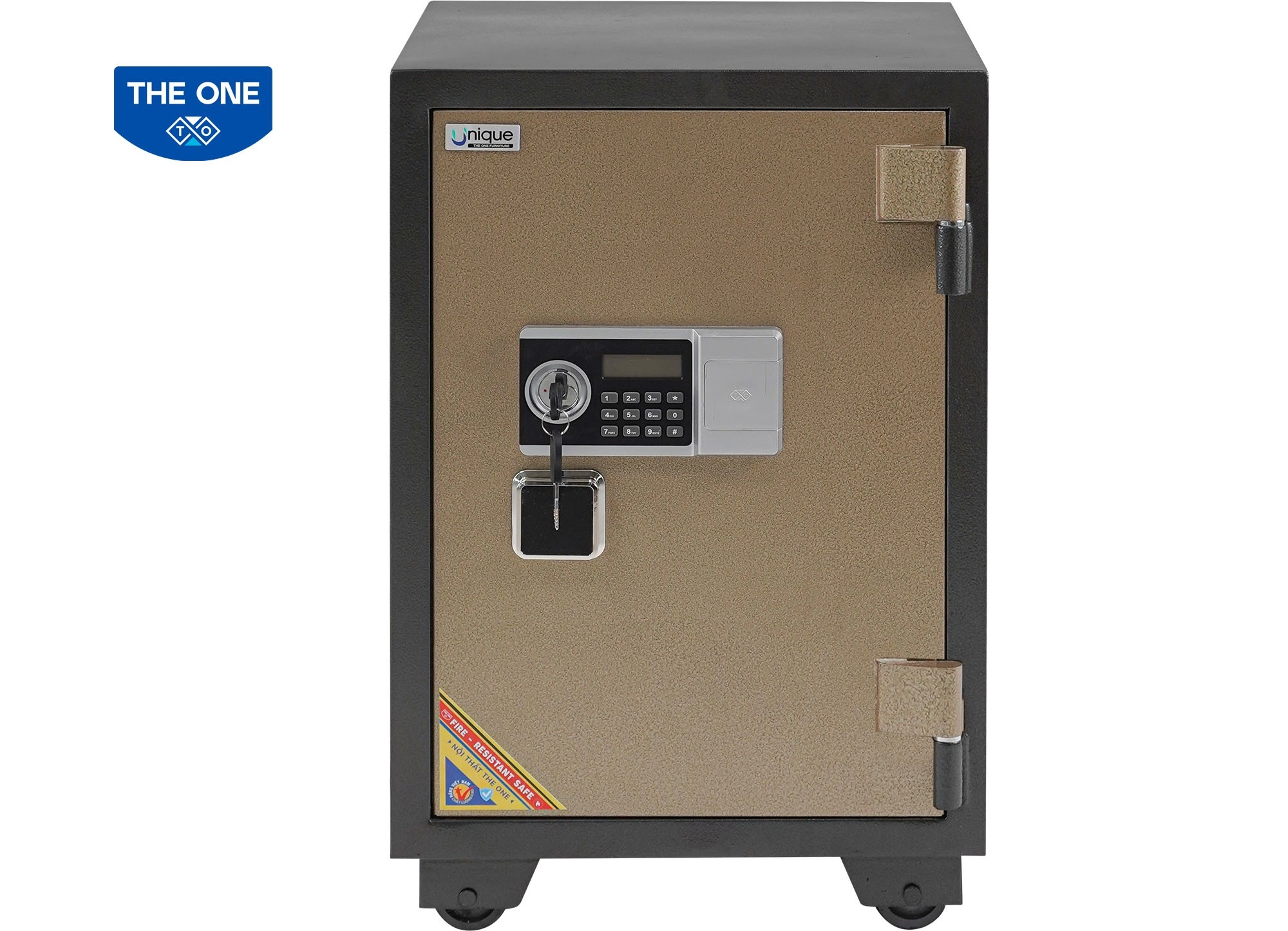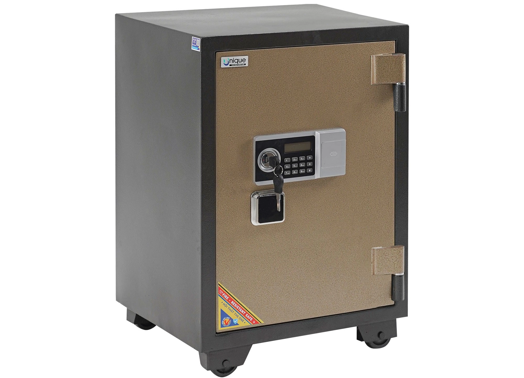 Két UN76 Kích thước ngoài: W470 x D456 x H760 mm Kích thước trong: W420 x D320 x H620 mm Két đứng có khoá chìa, khoá điện tử, tay nắm vuông, bên trong có ngăn phụ và 1 đợt di động. Bánh xe sắt di chuyển. Khối lượng: 76 kg (±10%) Dung sai kích thước: ± 2 mm (Lưu ý: Màu sắc hiển thị trên website có thể không chính xác do chụp ảnh, hoặc mô phỏng bằng ảnh 3D. Khách hàng vui lòng kiểm tra xác nhận màu sắc trước khi đặt hàng)