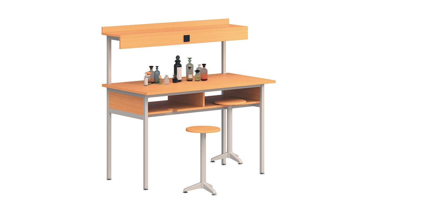 Bàn ghế thí nghiệm vật lý, khung ống thép sơn tĩnh điện. Mặt bàn composite và ngăn bàn gỗ melamine có thêm lỗ cài ghế.