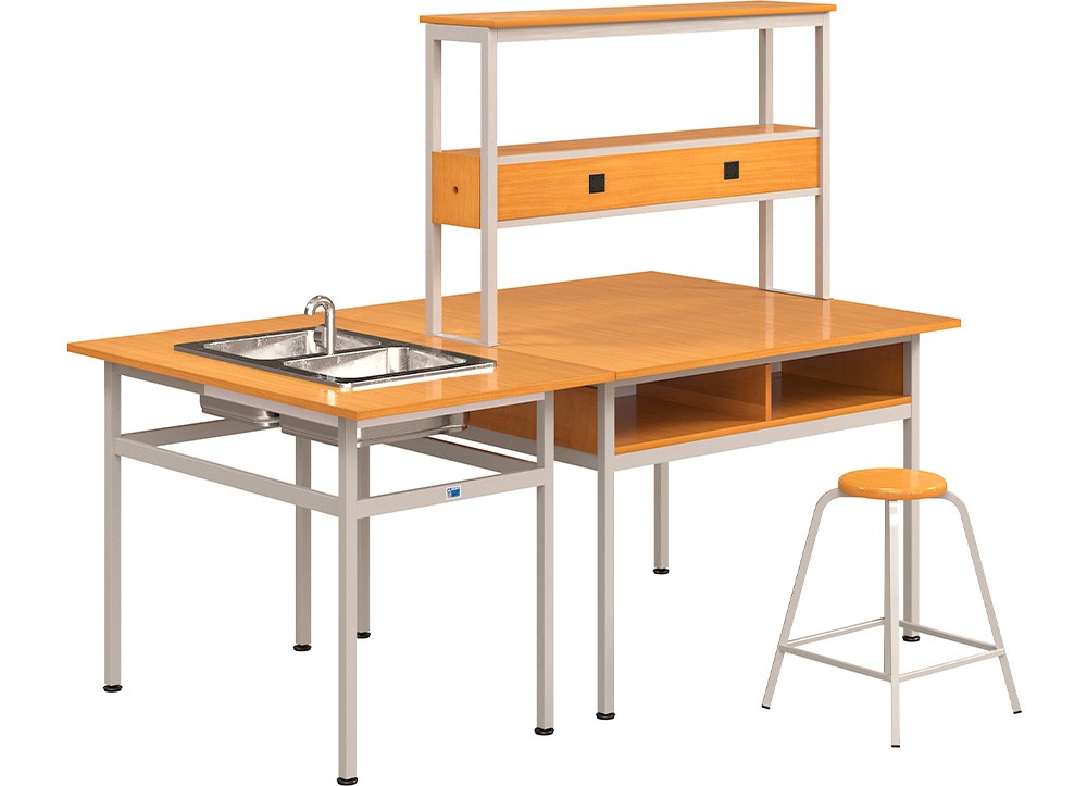 Bàn ghế thí nghiệm hoá sinh có chậu rửa và vòi nước. Khung thép sơn tĩnh điện, mặt bàn composite và ngăn bàn gỗ melamine.