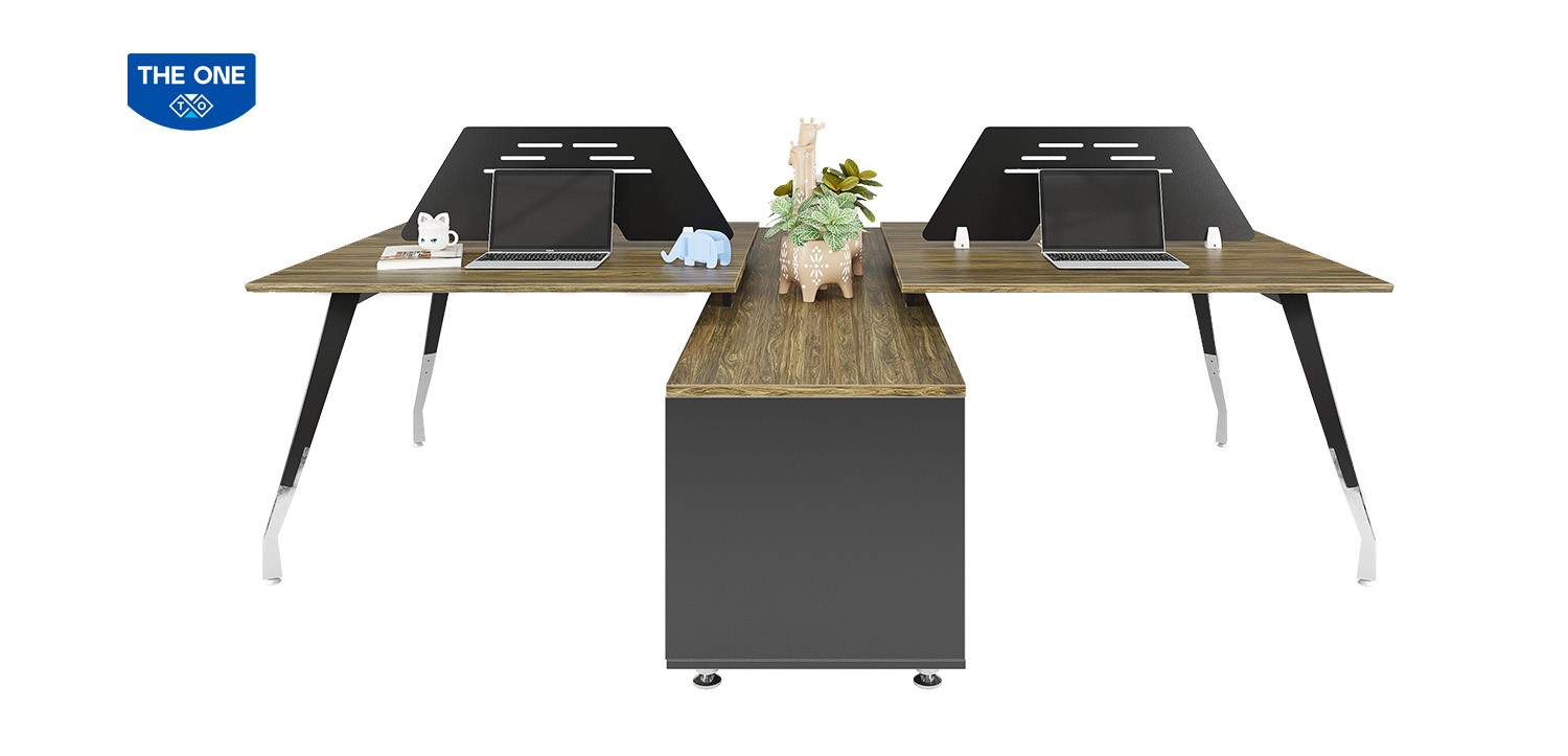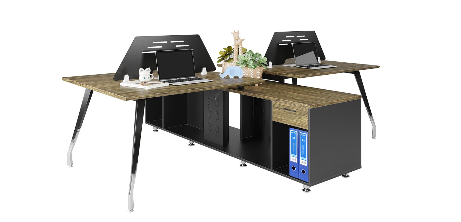 Modul làm việc 4 chỗ có tủ phụ liền bàn mỗi vị trí có 1 ngăn kéo, khoang để tài liệu và CPU, phần gầm có sẵn vị trí đột chờ để bắt ổ điện. Mặt bàn vát cạnh 45 độ hai cạnh dài, có nắp luôn dây chung và vách tôn hình thang được đột oval trang trí. Chân bàn thép dập định hình sơn đen nhám kết hợp mạ.