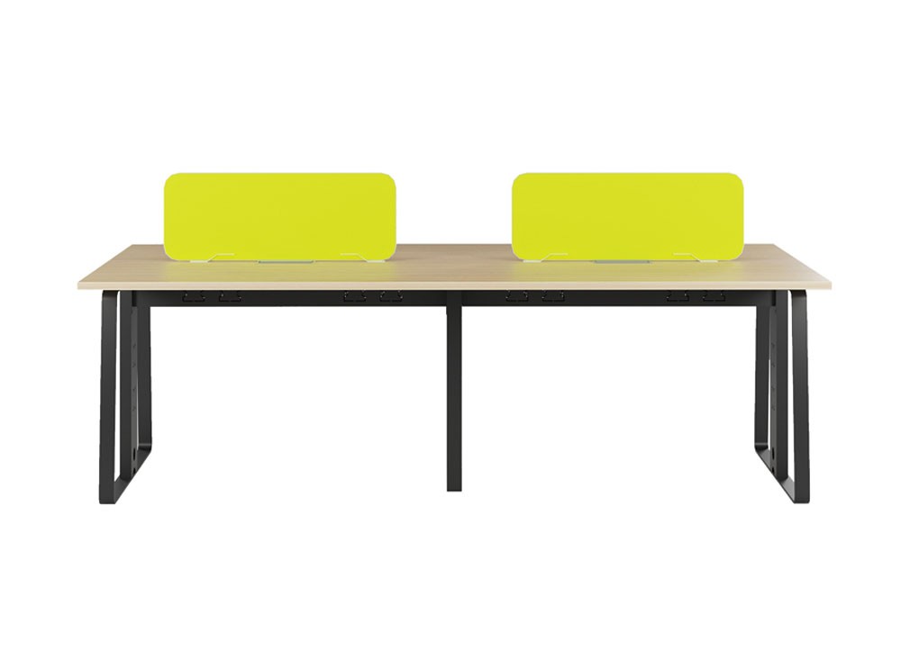 Module làm việc 4 chỗ ngồi, sử dụng ống 10x50. Có máng đi dây điện kết hợp giằng bàn, chân bàn có hộp điện đi dây và tăng cứng khung chân. Vách ngăn gỗ bọc vải nỉ.