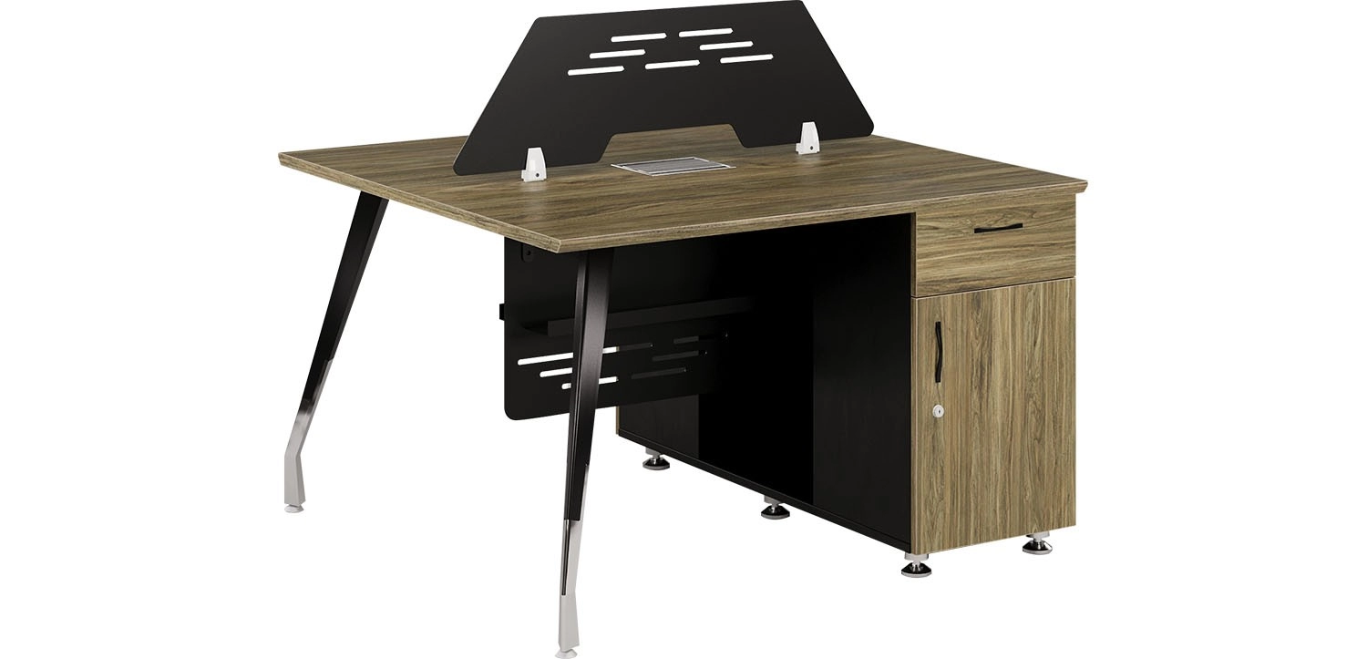 Modul làm việc 2 chỗ chân C15, mặt bàn gỗ melamine cao cấp có vách tôn sơn đen. Bàn sử dụng hộc liền, giữa hai hộc có chỗ để CPU