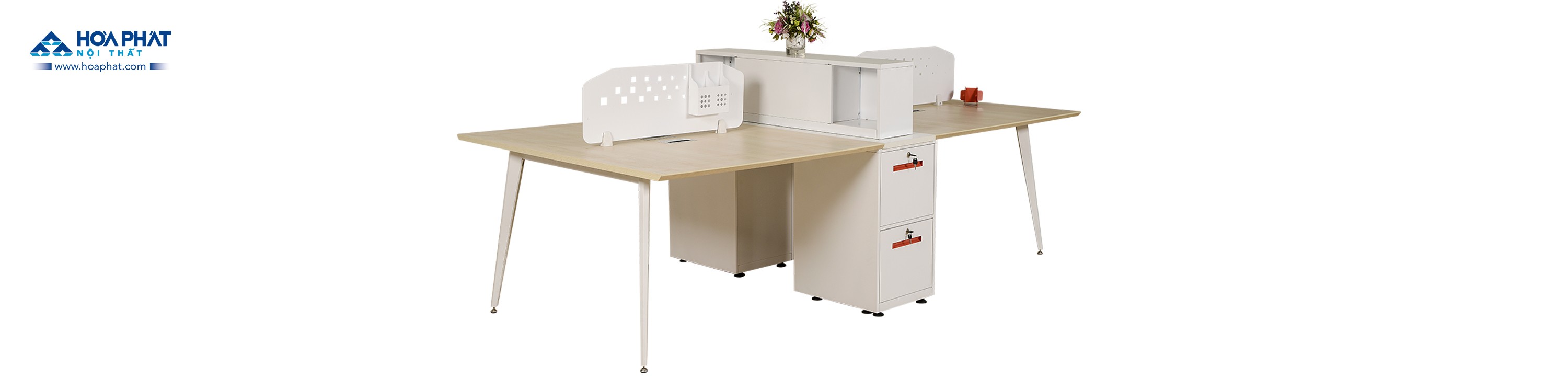 Module làm việc cho nhân viên sử dụng chân thép sơn tĩnh điện C10, ở giữa module có hộc sắt mỗi bên 2 ngăn kéo và khóa riêng biệt được sơn màu trắng.
