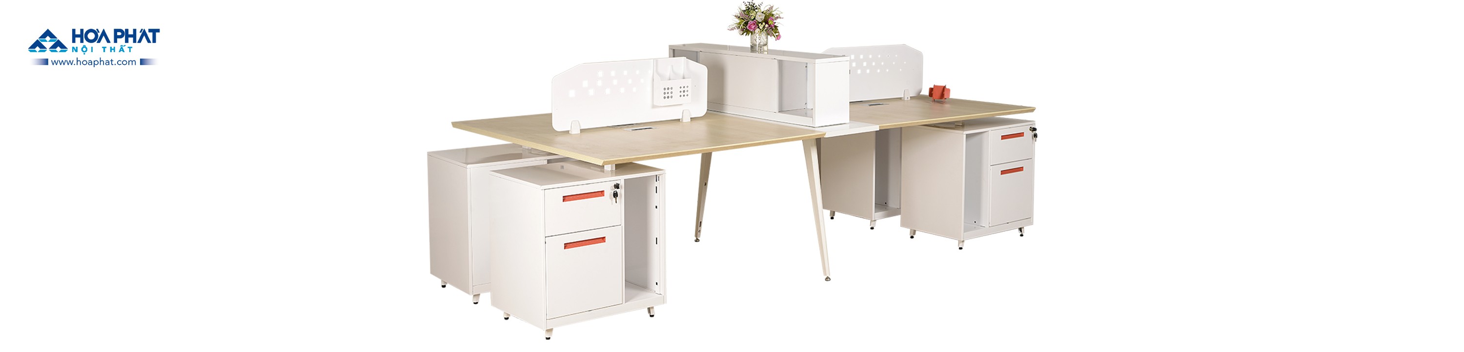 Module làm việc cho nhân viên sử dụng chân thép sơn tĩnh điện C10, đầu các bàn làm việc có hộc sắt và khoang để CPU sơn màu trắng, tay nắm ngăn kéo sơn màu cam.