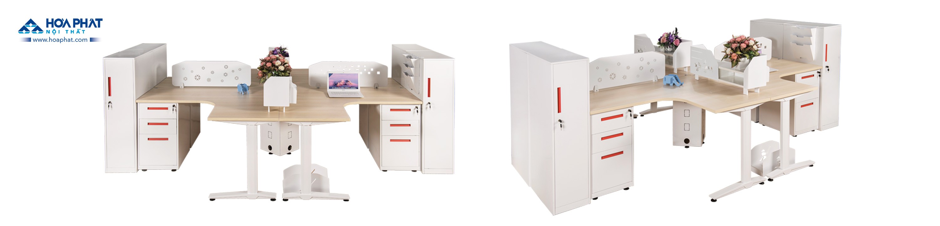Bàn có vách bằng hộc sắt và vách ngăn bằng tôn, và giá để tài liệu/đồ decor