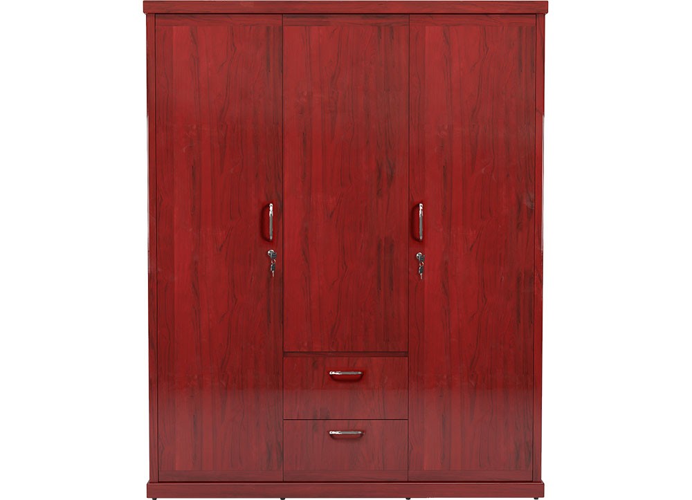 Tủ áo gia đình 3 buồng gỗ công nghiệp và phủ sơn PU. Hai buồng trên cánh dài mở, buồng giữa phía trên ngăn kéo cánh gỗ mở, phía dưới có 2 ngăn kéo.