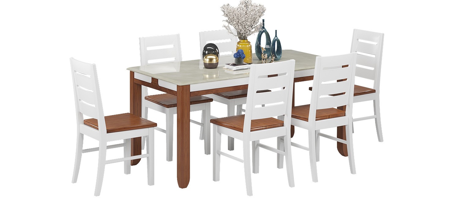 Bàn ghế ăn cao cấp khung gỗ tự nhiên, mặt bàn sử dụng đá tự nhiên được tạo vân theo công nghệ hiện đại.