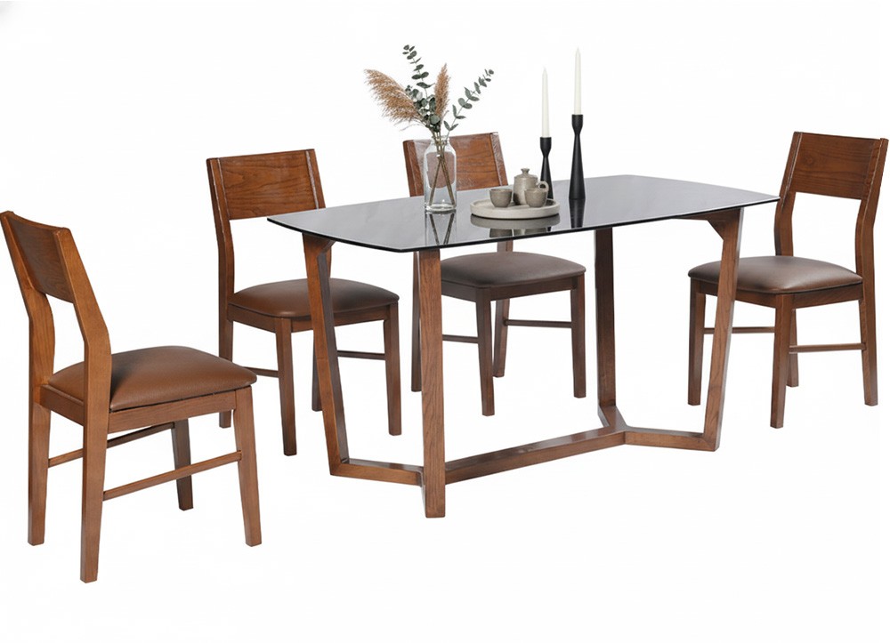 Bộ bàn ghế ăn cao cấp khung gỗ tự nhiên trong đó mặt bàn sử dụng kính cường lực cao cấp, đệm ghế sử dụng liệu PVC chất lượng cao.