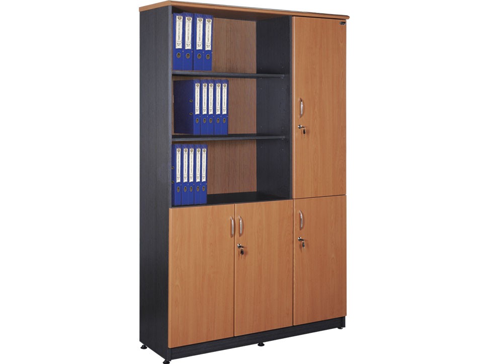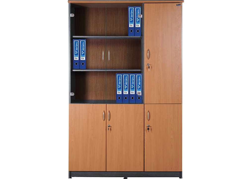 Phía trên có 2 khoang cánh kính để tài liệu và 1 khoang treo áo, phía dưới có 3 khoang cánh mở.