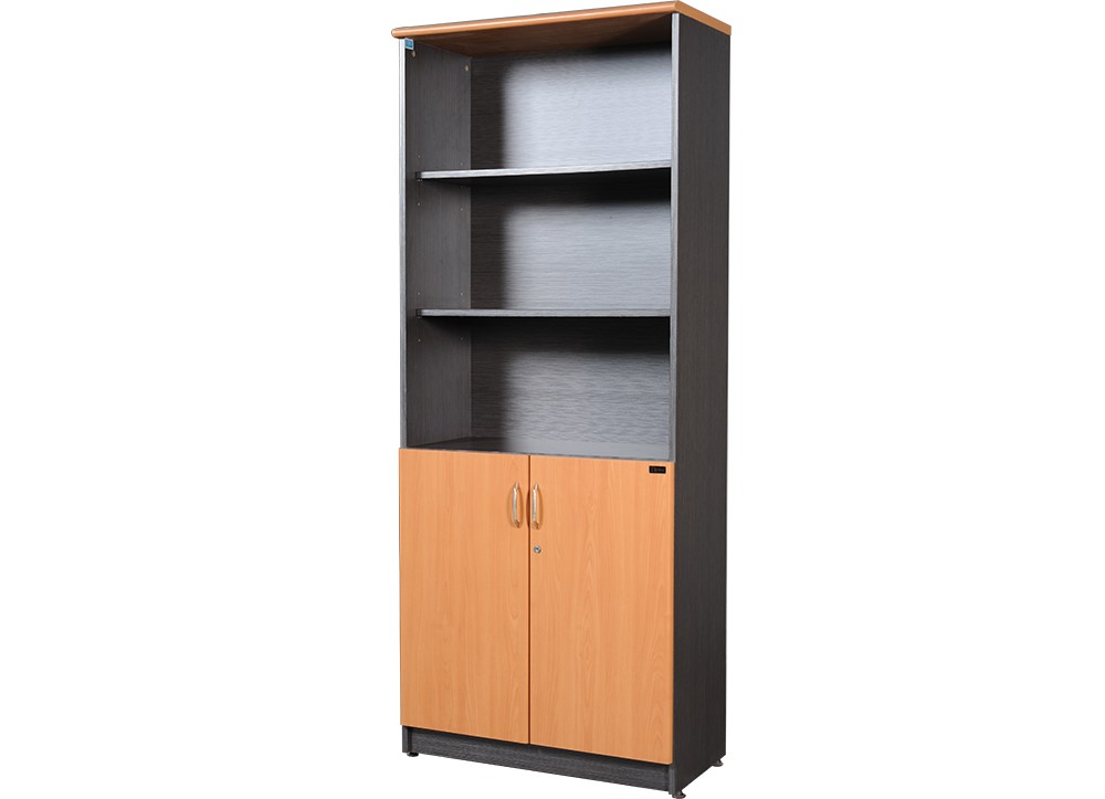 Tủ tài liệu 2 khoang, khoang trên cánh kính có 2 đợt, khoang dưới cánh gỗ mở.