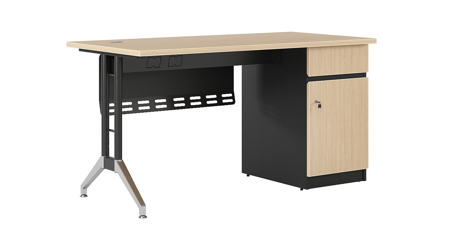Operator Desk with cabinet, MFC desktop and powder-coated combined chrome-plated legs. The desk has a strong crossbar which can be used as a cable trunking.