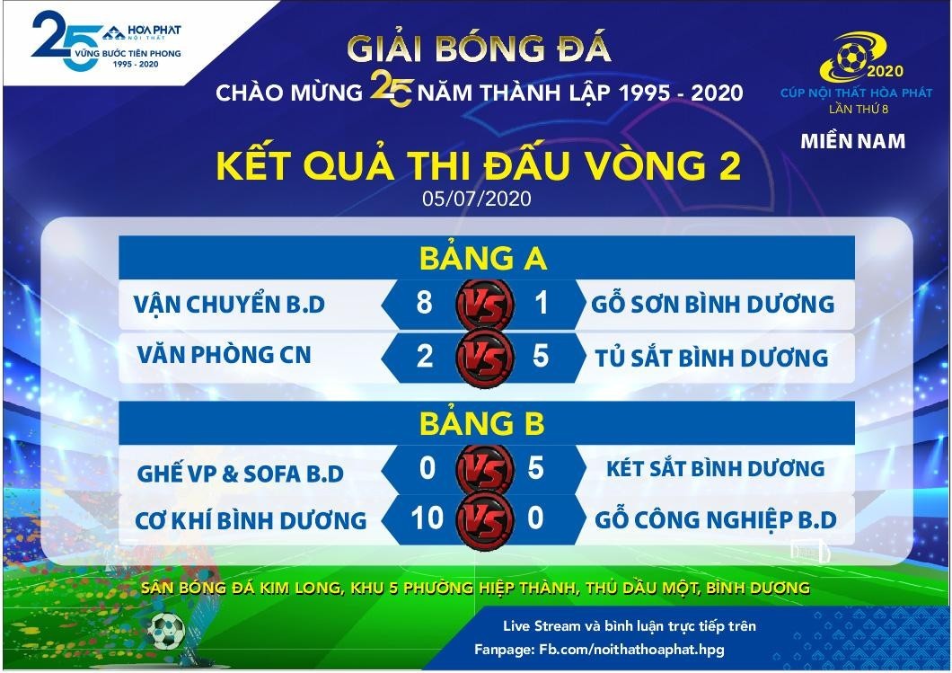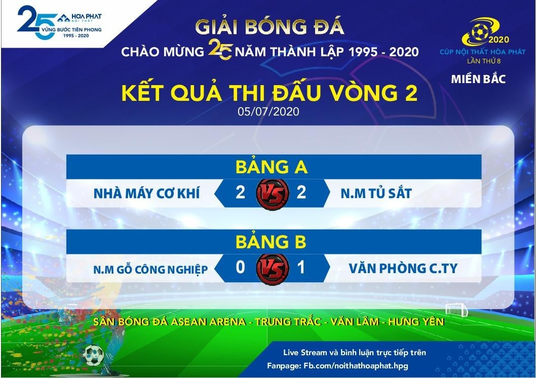 Ngày 05/07, Vòng 2 giải bóng đá tranh cúp Nội thất Hòa Phát đã diễn ra sôi nổi với 36 bàn thắng được ghi tại 2 miền Nam – Bắc.