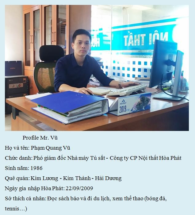 Là lãnh đạo trẻ mới được đề bạt của Nhà máy Tủ sắt – Công ty CP Nội thất Hòa Phát, anh Phạm Quang Vũ tiêu biểu cho lớp lãnh đạo trẻ năng động, có tinh thần cầu tiến, tìm tòi nghiên cứu công nghệ mới. Đối với anh hệ thống máy móc thiết bị hiện đại của Nhà máy là một niềm đam mê. Quản lý mảng kỹ thuật, chất lượng sản phẩm và tham gia một phần điều hành sản xuất tại nhà máy, phương châm của anh là “làm đúng ngay từ đầu” để từng chi tiết sản phẩm đạt được tiêu chí chất lượng. HPG News đã có cuộc trao đổi với anh Phạm Quang Vũ nhân ngày sinh nhật Công ty Nội thất (1/11/2019).