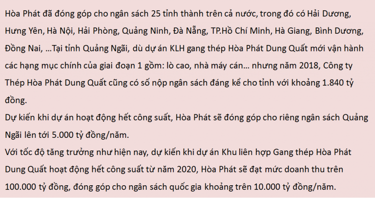 Số nộp ngân sách của Hòa Phát trong năm 2018 tương đương với tỉnh Bình Định, địa phương xếp thứ 34 trong số 63 tỉnh thành trên cả nước về nộp ngân sách. Trong vòng 10 năm từ (2008 – 2018), các công ty thành viên của Tập đoàn Hòa Phát đã đóng góp cho ngân sách Nhà nước tới 27.000 tỷ đồng, vượt dự toán thu ngân sách của Đà Nẵng, địa phương nằm trong Top 10 tỉnh có số thu ngân sách lớn nhất cả nước năm 2018.