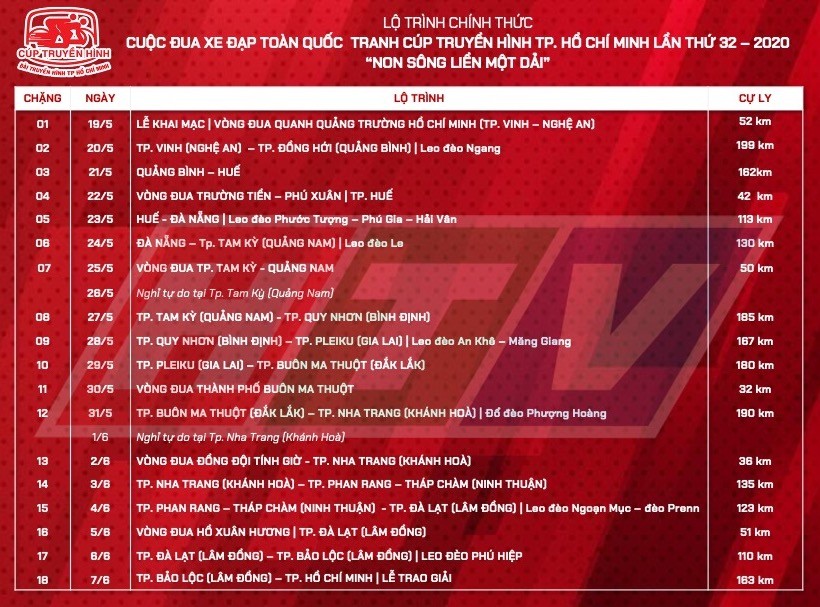 Giải đua được phát sóng truyền hình trực tiếp trên HTV7, HTV9 và HTV Thể thao trong khung giờ từ 8h đến 11h, từ ngày 19/05 đến 07/06/2020.